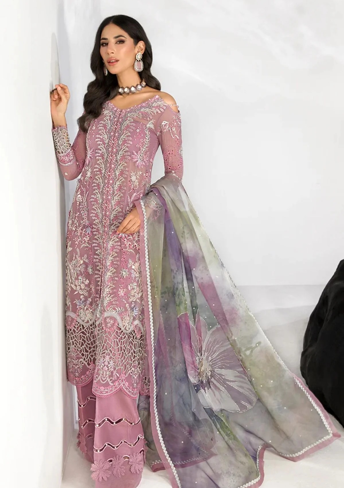 Crafted in a mesmerizing palette of Lilac, Dusty Rose, and Mint Green, this outfit is a visual symphony. The luxurious chiffon and organza fabrics flow with elegance, making it a perfect choice for bridal functions, grand weddings, and prestigious soirées.