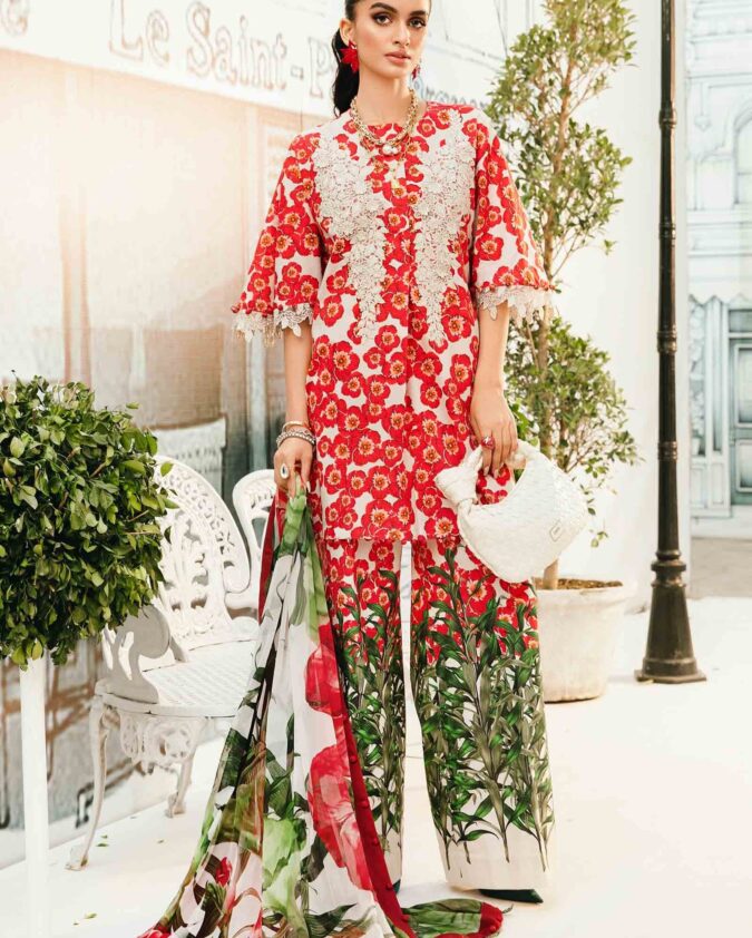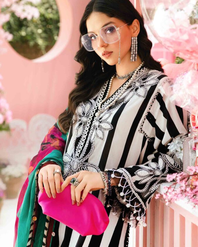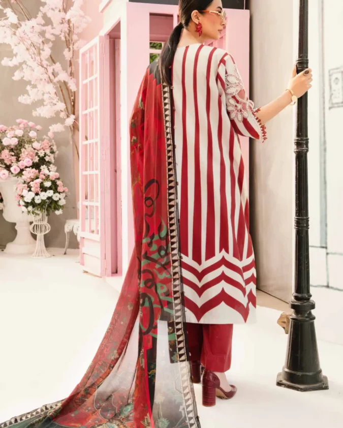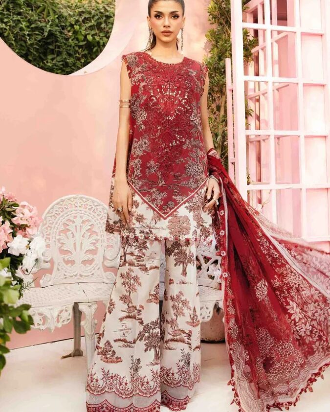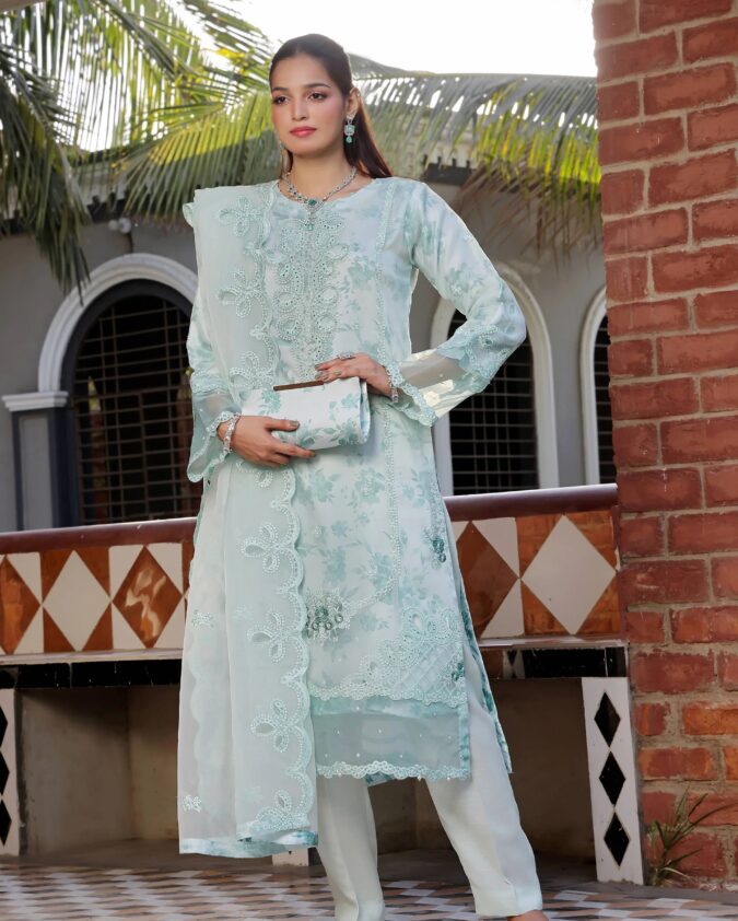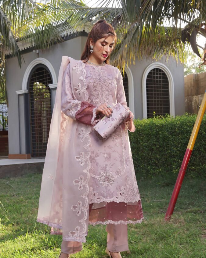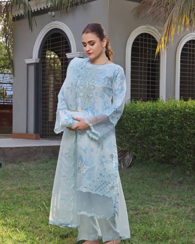 The Shirt: Semi-Stitched Embroidered Organza The Dupatta: Elegantly Embroidered Ornate Organza The Trouser: Unstitched Slub Viscose A Special Gift: Free Premium Designer Clutch